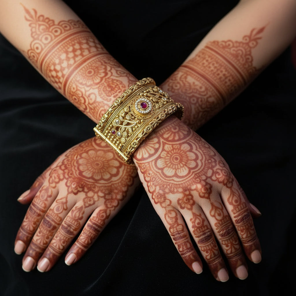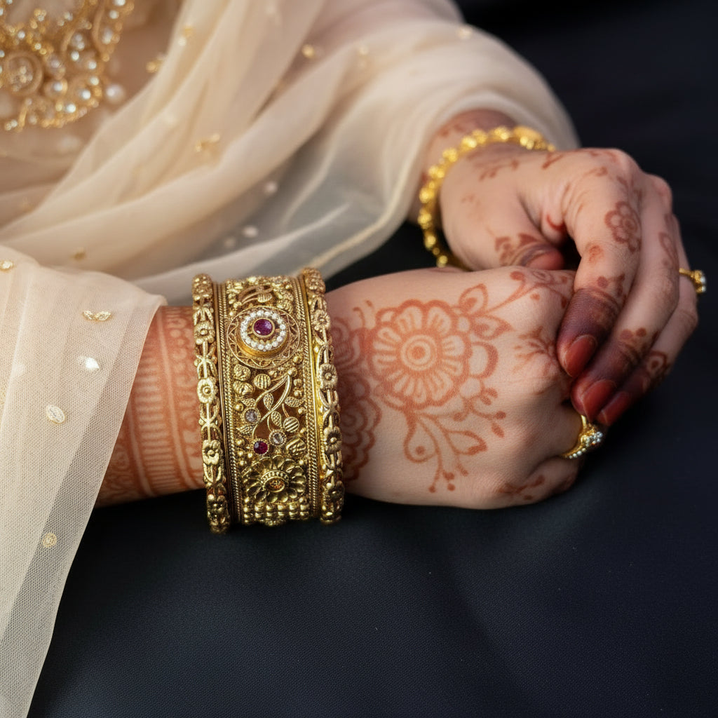 Elevate your ethnic look with this magnificent 2-piece Rajwadi Kangan Set. These stunning bangles feature a heavy, traditional design, paying tribute to classic Indian royal jewelry. The base is crafted with a rich antique gold plating, giving it a vintage, matte finish that pairs beautifully with traditional outfits. Each piece is intricately studded with dazzling ruby-red stones (or high-quality synthetic stones) that add a vibrant contrast and luxury appeal. Perfect for weddings, festivals, and formal occasions, these Antique Gold Plated Ruby Stone Bangles are essential for any jewelry connoisseur. Shop this premium Rajwadi Kangan set online today